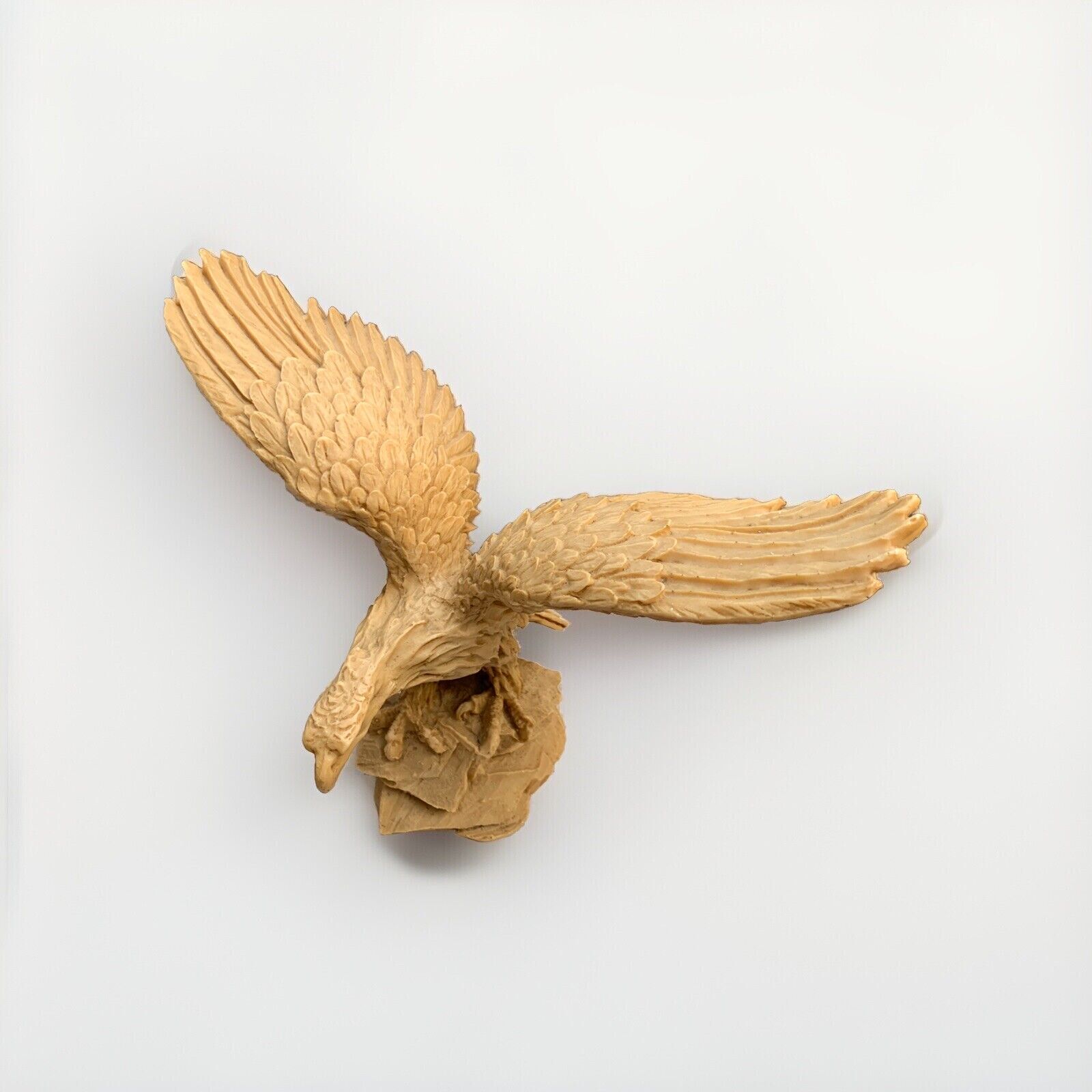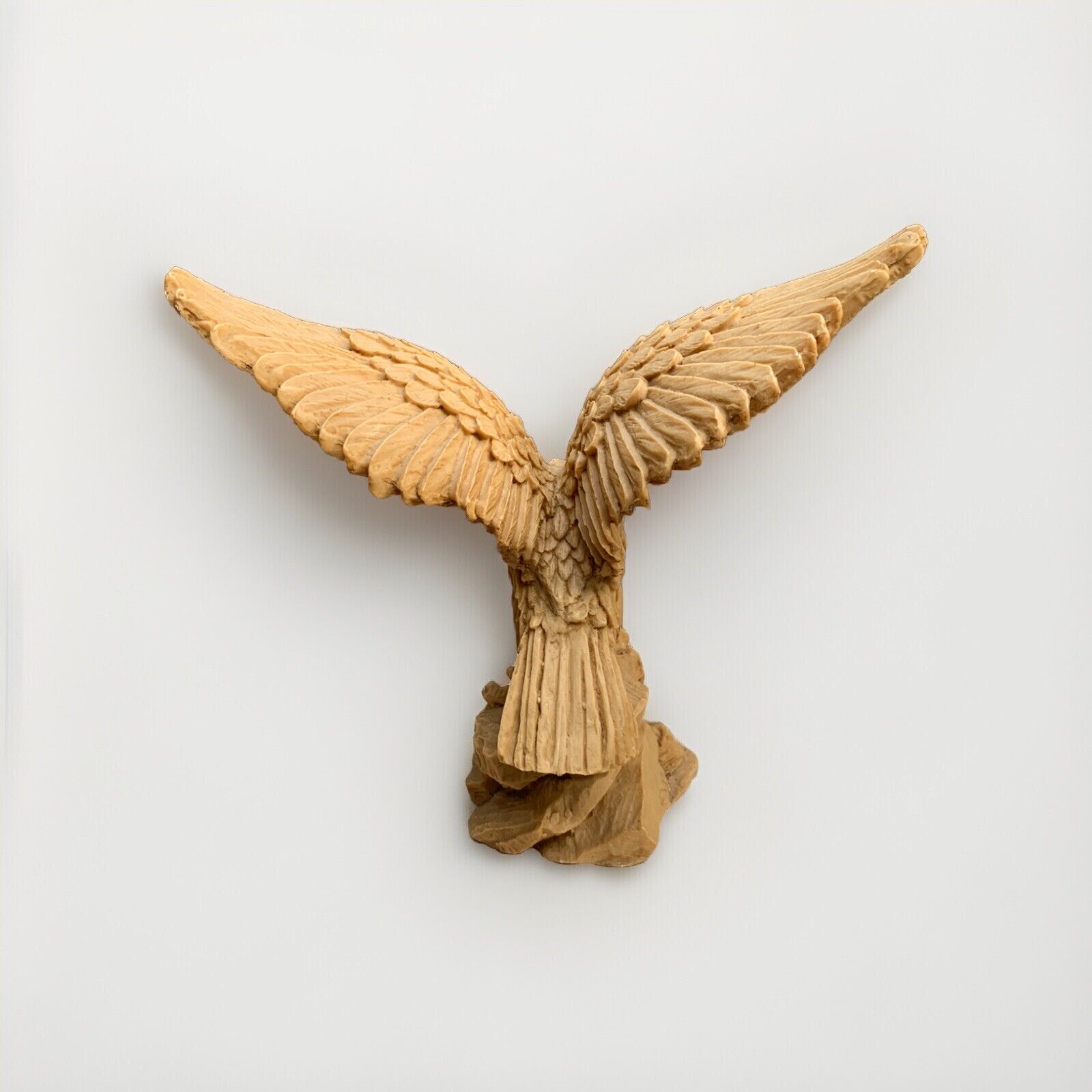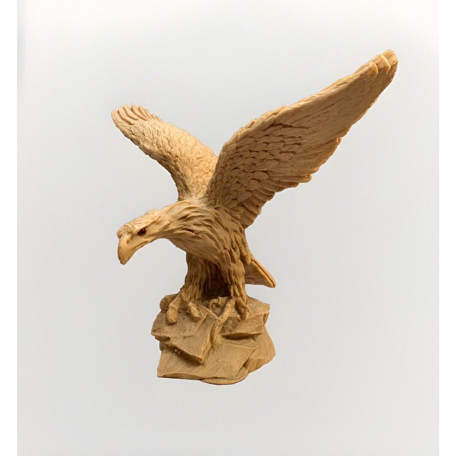 This vintage eagle sculpture statue stands at 12 inches tall with a wingspan of 13 inches. The statue features intricate carvings in alabaster and resin, with a stunning 3D and figurative art style. The red eyes and soaring pose capture the essence of the bird's majesty.