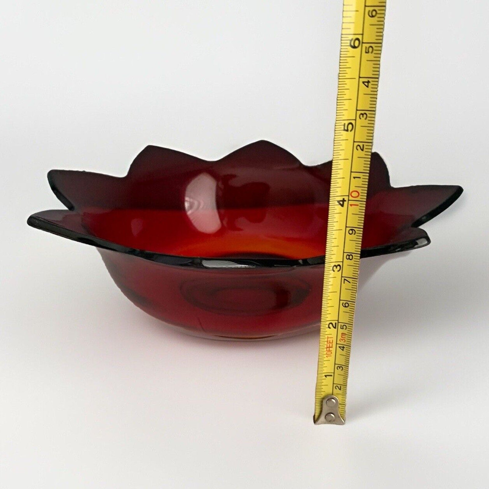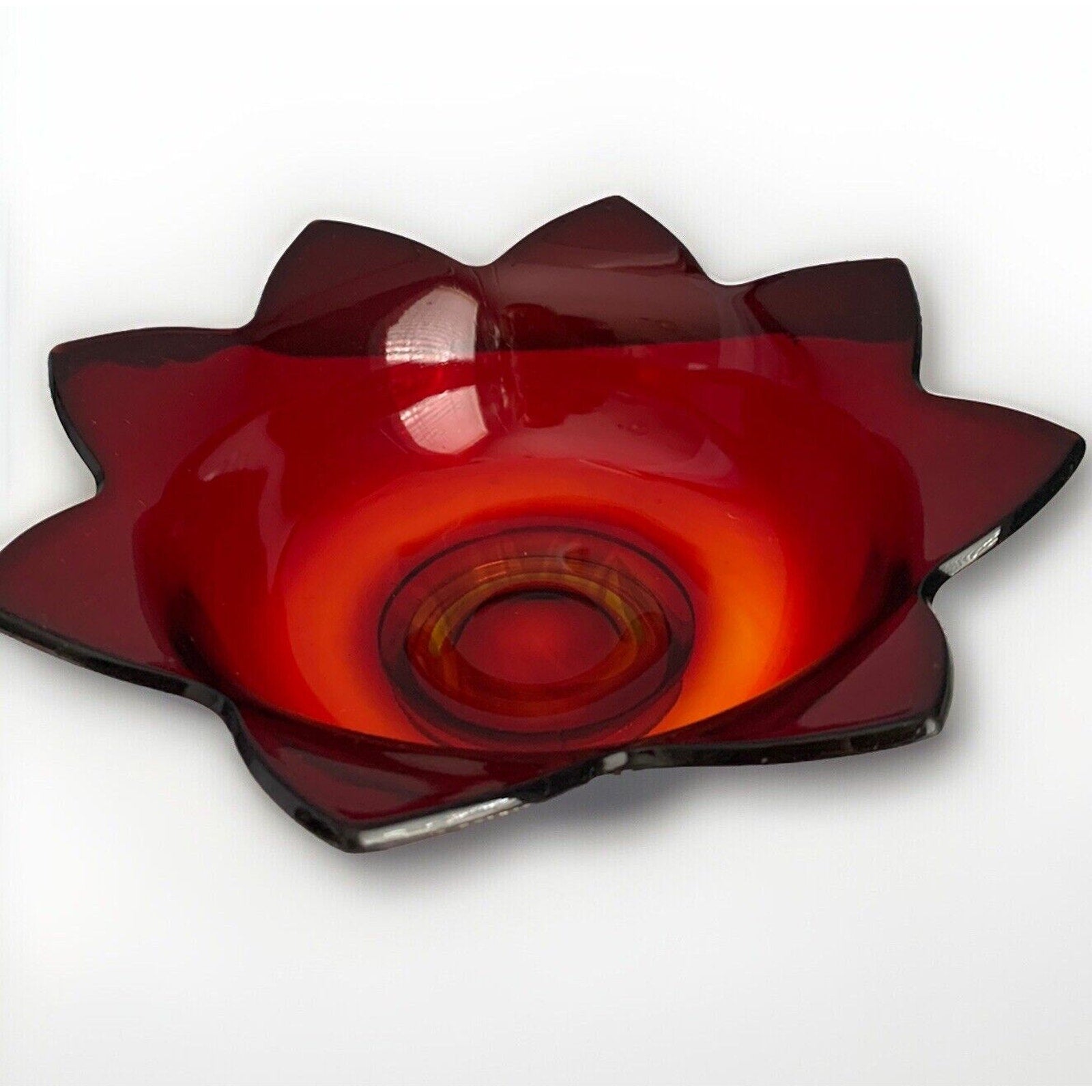 Great condition. No chips or cracks. This vintage Fenton Amberina bowl is a stunning addition to any collection. The ruby red and orange glass, along with the lotus shape and flower theme, make it a beautiful decorative piece. Measuring 9 inches in length, 2.5 inches in depth, and 3 inches in height, this bowl is perfect for serving candy or other small items.