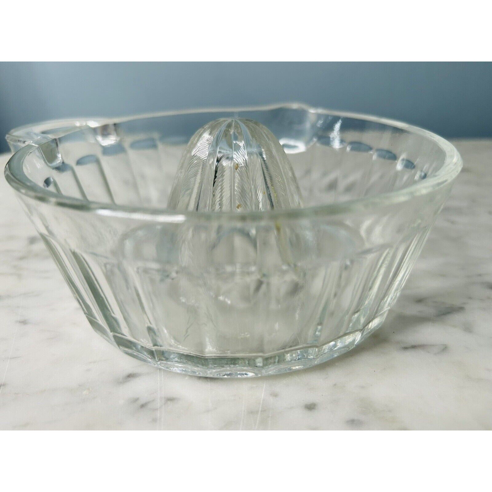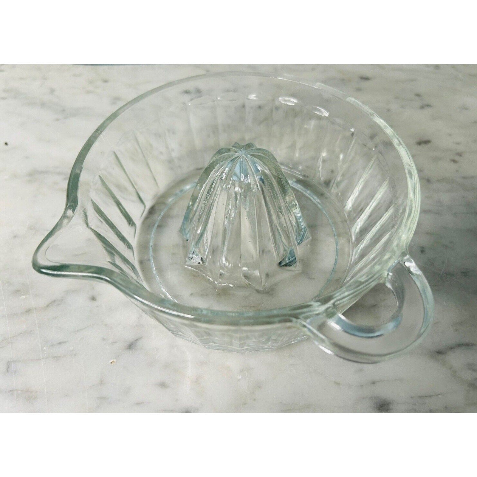 Great piece with a different shape than most vintage juicers (handle placement). This is a Vintage Indiana Glass Citrus Juicer/reamer made of clear glass. It features a side spout, loop tab handle, and a deep design for efficient juicing. The item is approximately 4 inches tall, 6 inches in diameter, and weighs 1 pound 9 ounces. It is recommended for hand washing only.