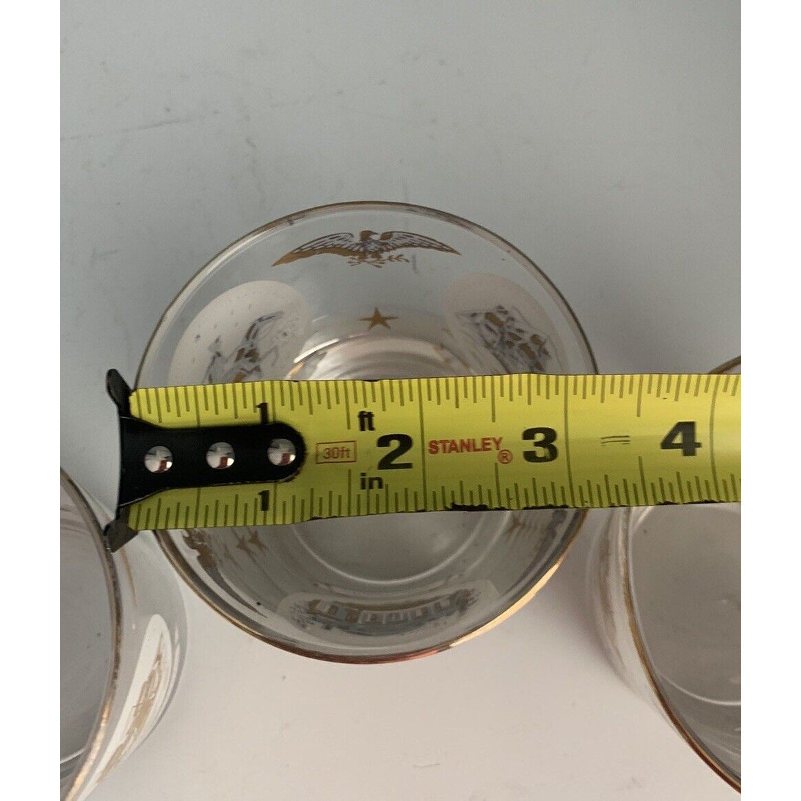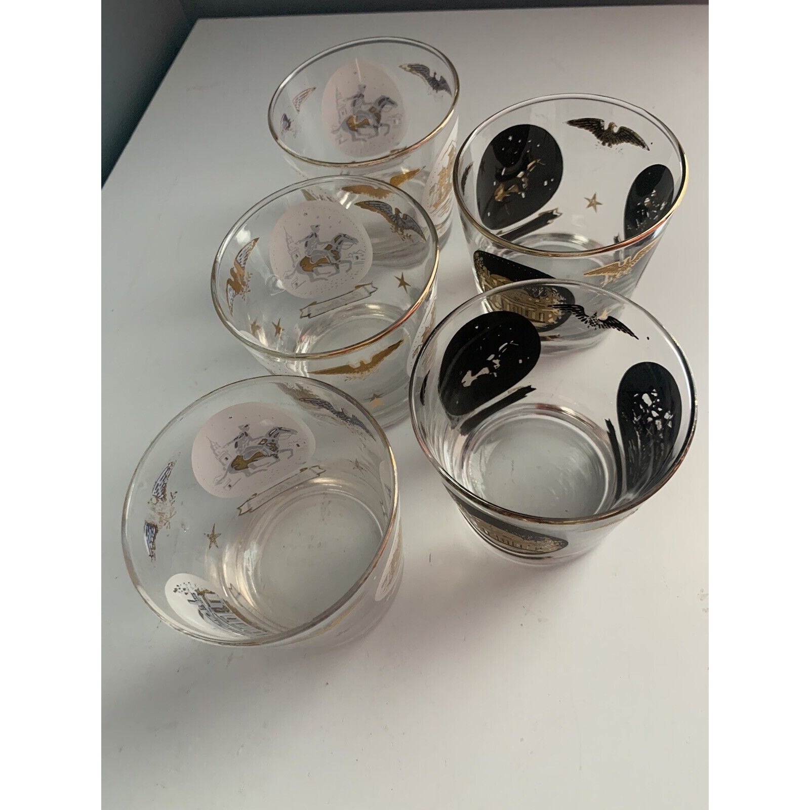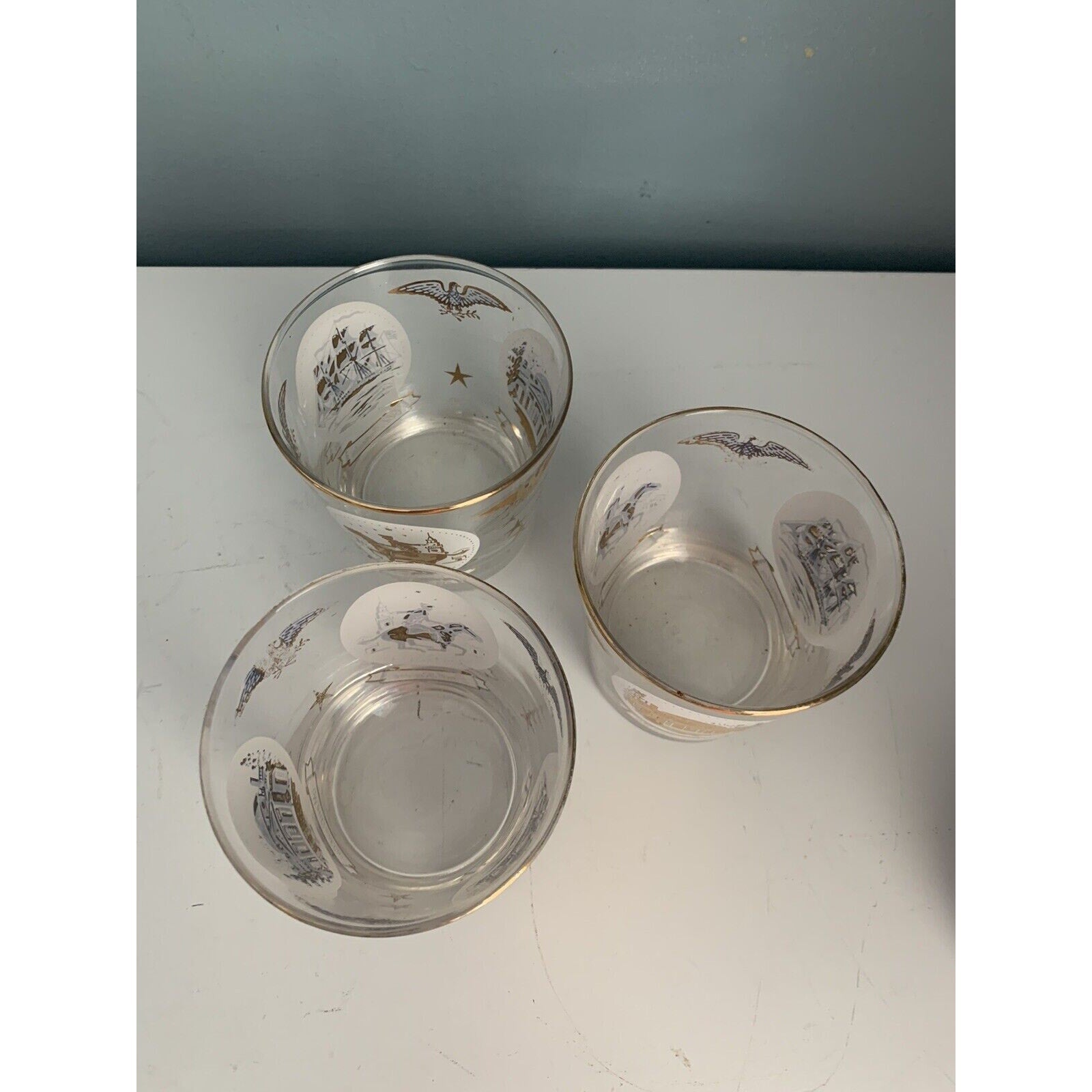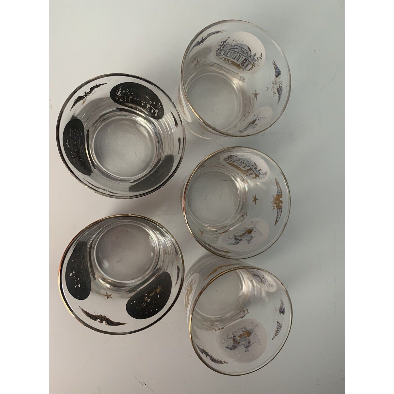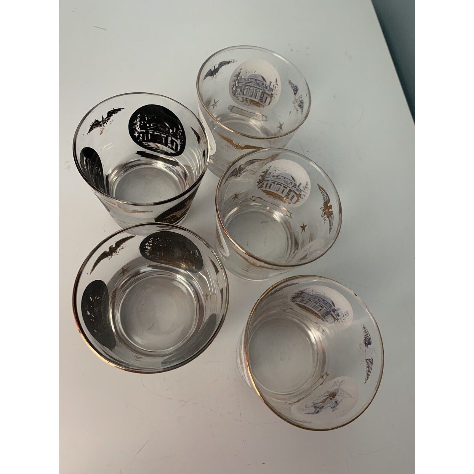 The glasses come with a rocking glass feature and are perfect for serving your favorite whiskey or cocktail. The glasses are an original piece and are not licensed reproductions. They weigh 2 pounds and 10 ounces in total and have a height of 3 1/4 inches. Hand wash only is recommended for care instructions. Get your hands on these unique glasses and add a touch of history to your collection.