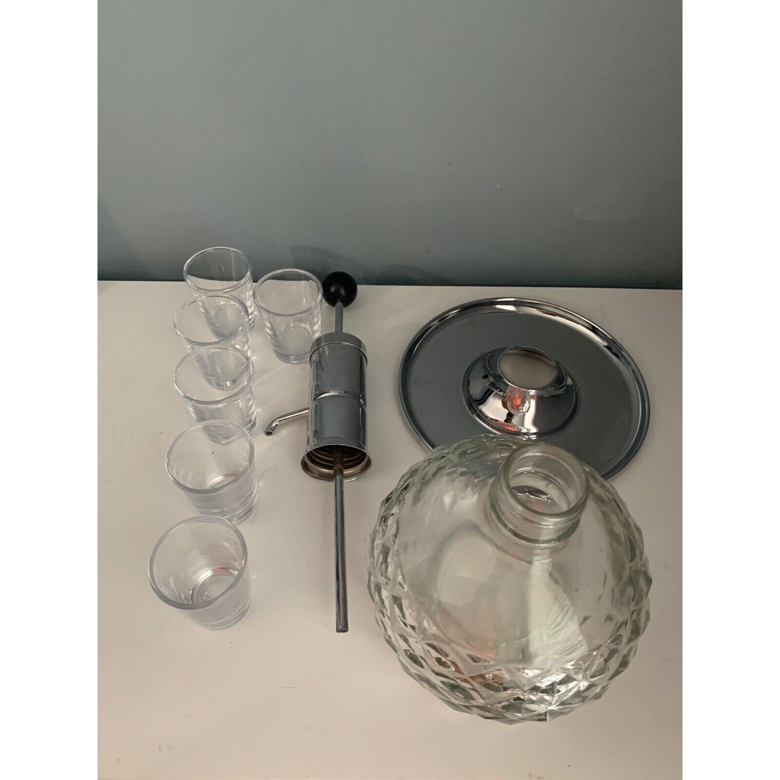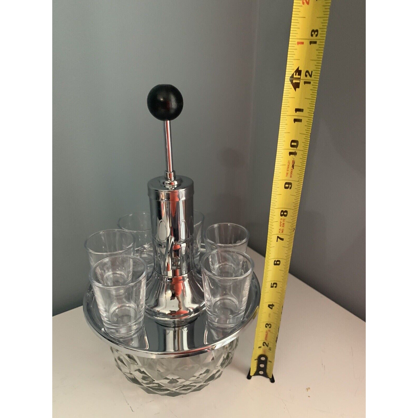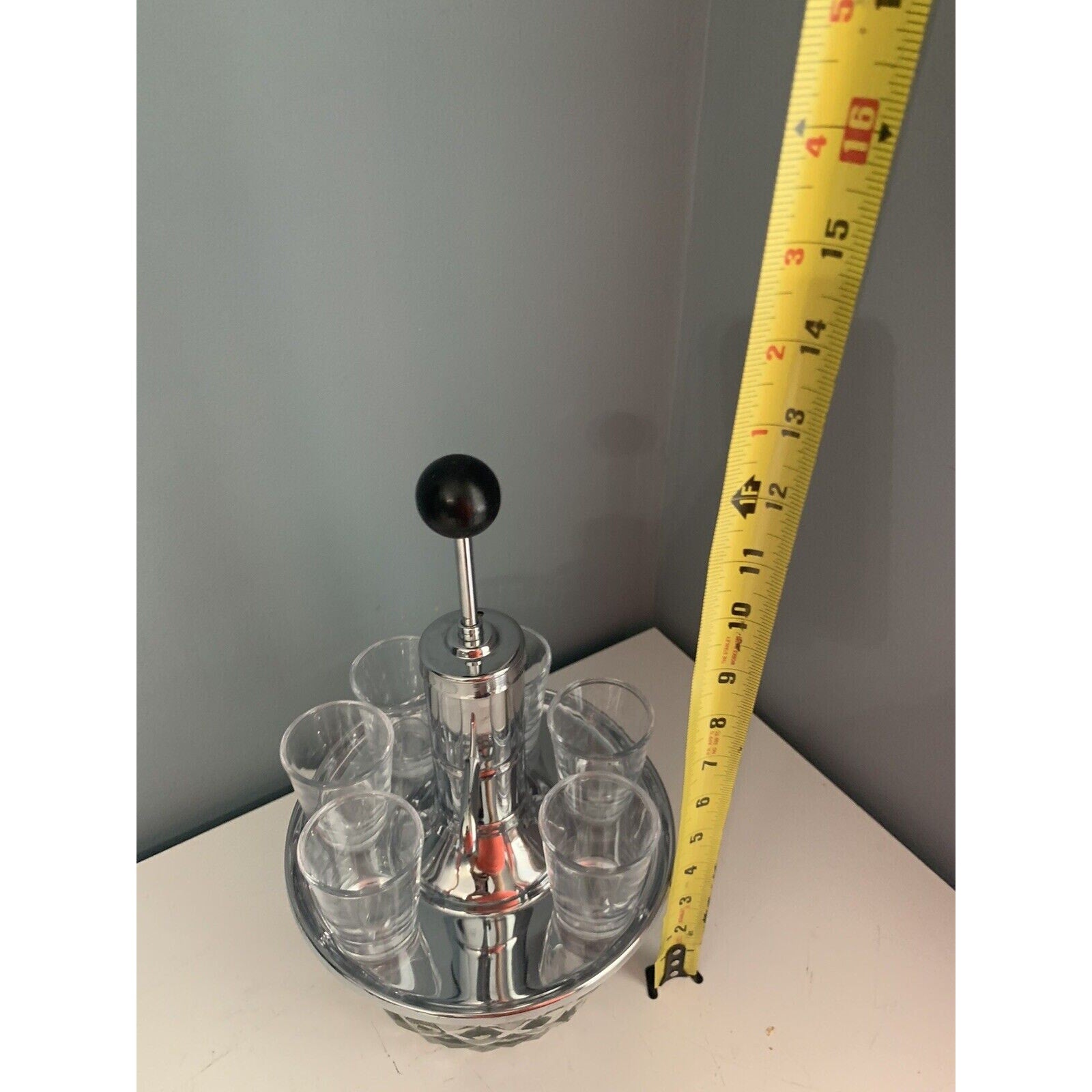 Beautiful condition. No chips or cracks. Vintage cocktail dispenser with six shot glasses. Glass and chrome.