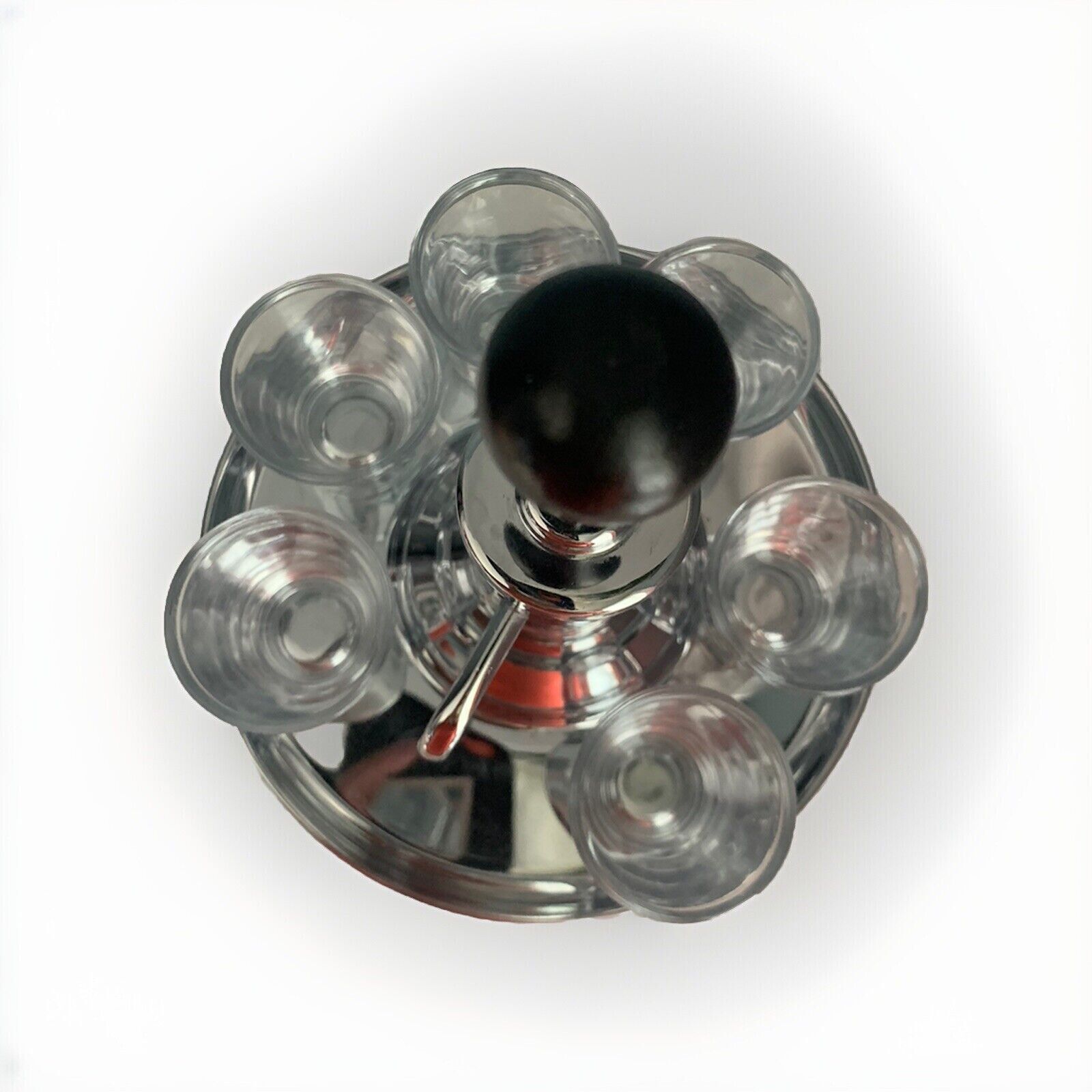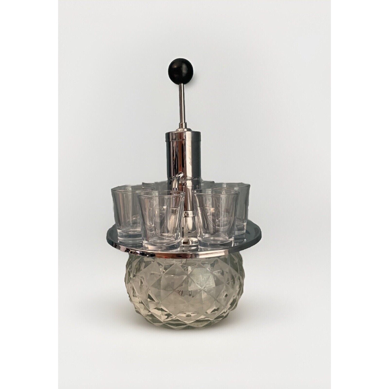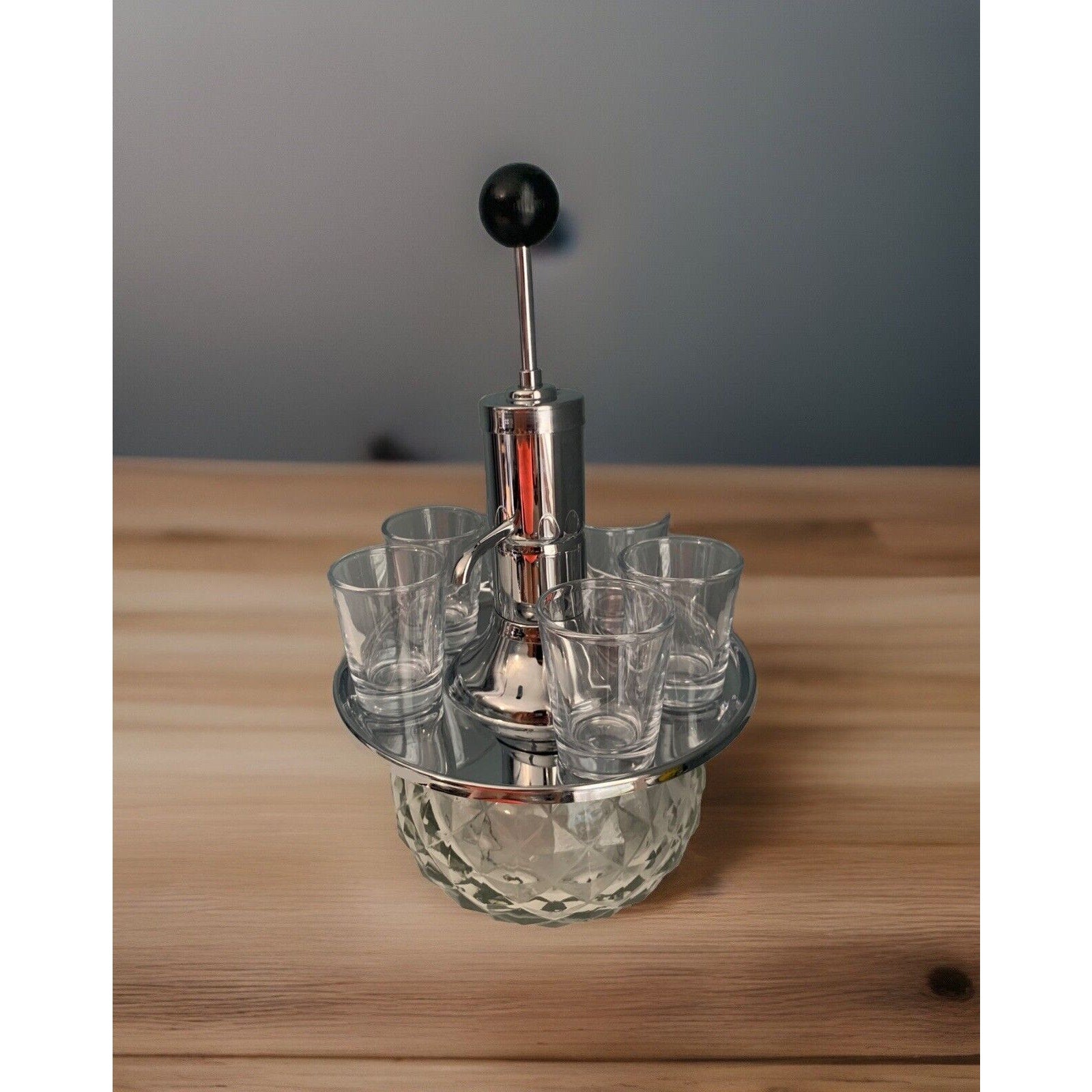 Beautiful condition. No chips or cracks. Vintage cocktail dispenser with six shot glasses. Glass and chrome.