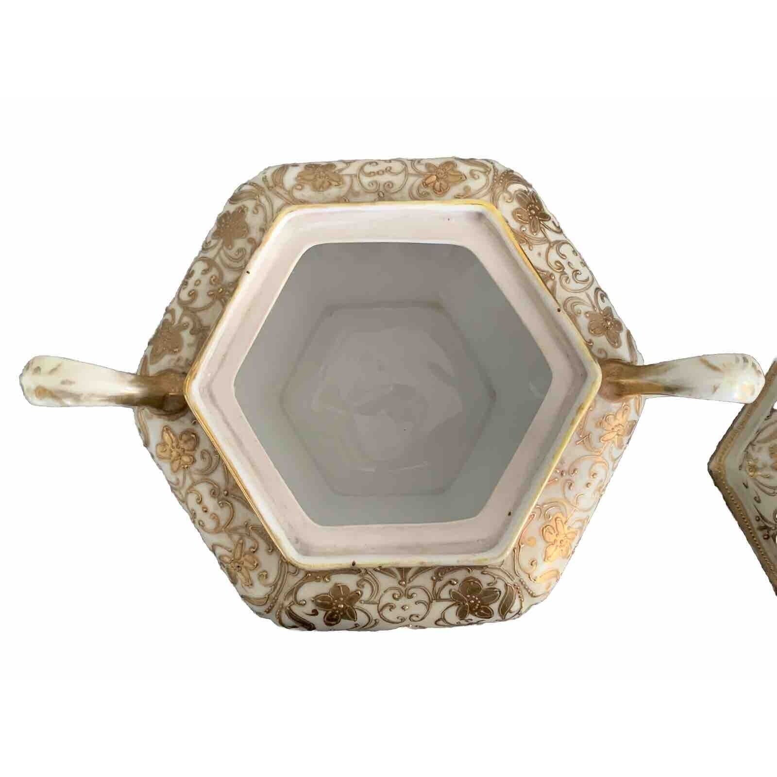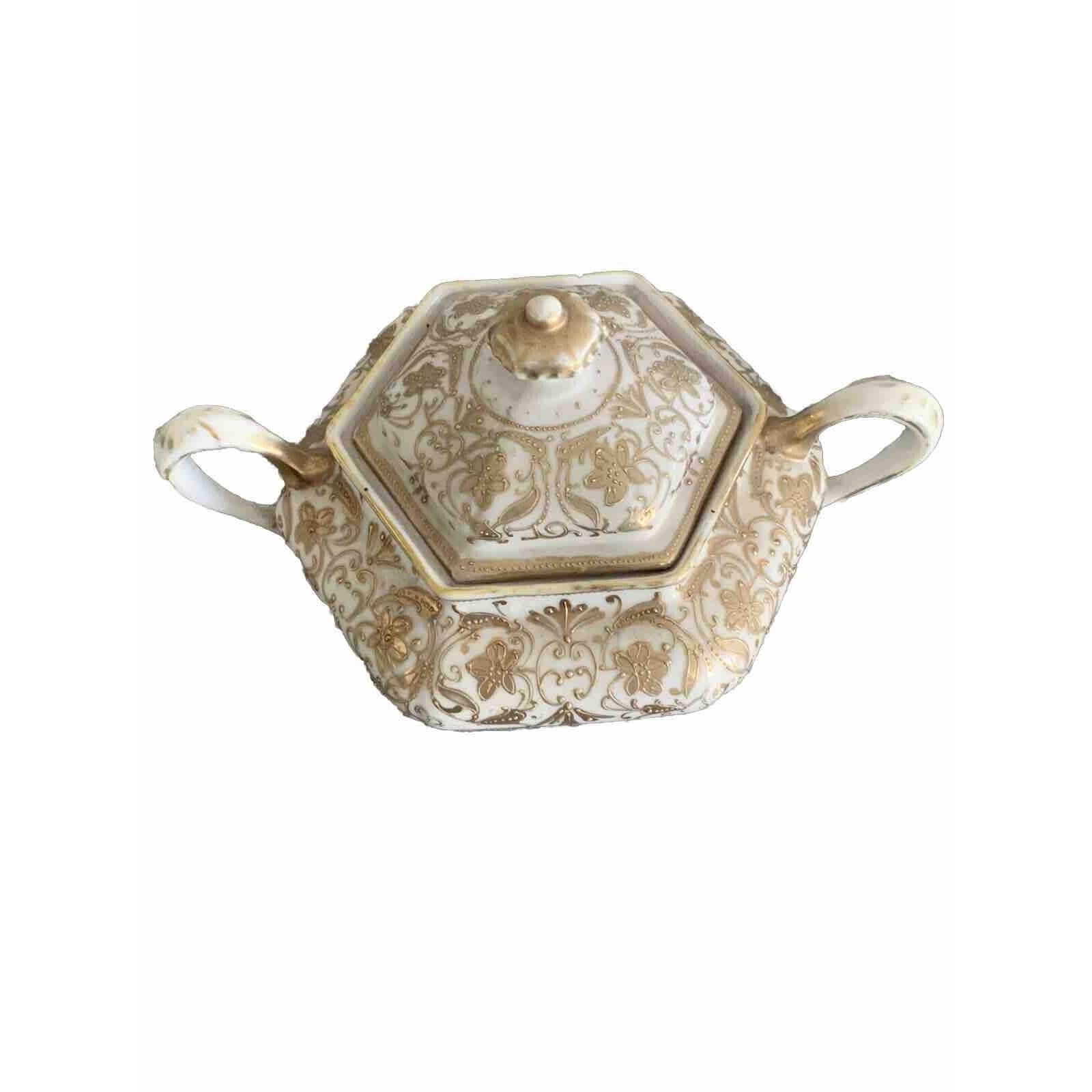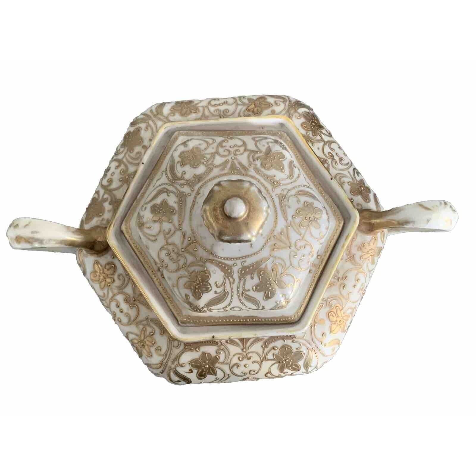 Vintage Nippon Gold Gilded Moriage Porcelain Hexagon Sugar Bowl Hand Painted Lid