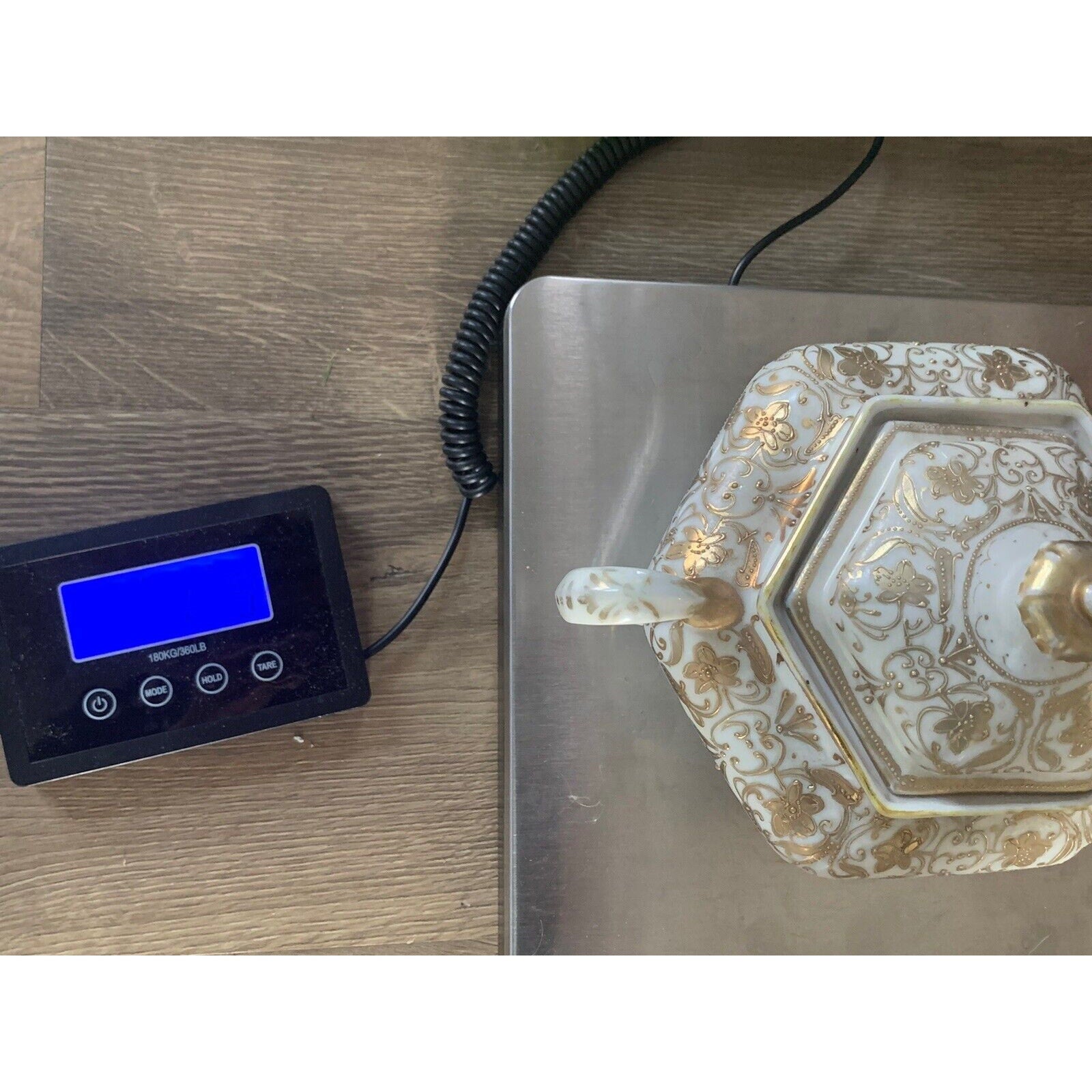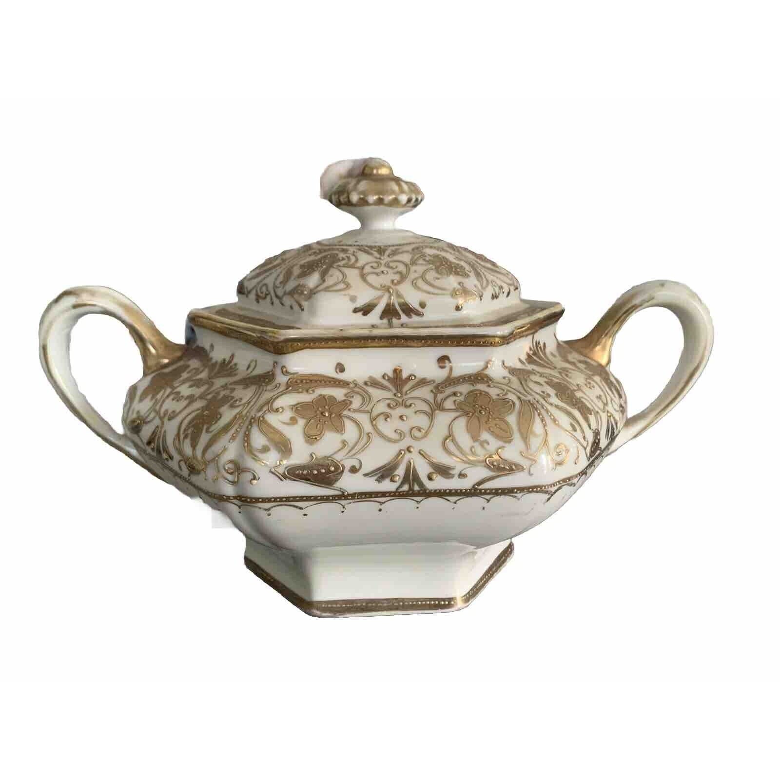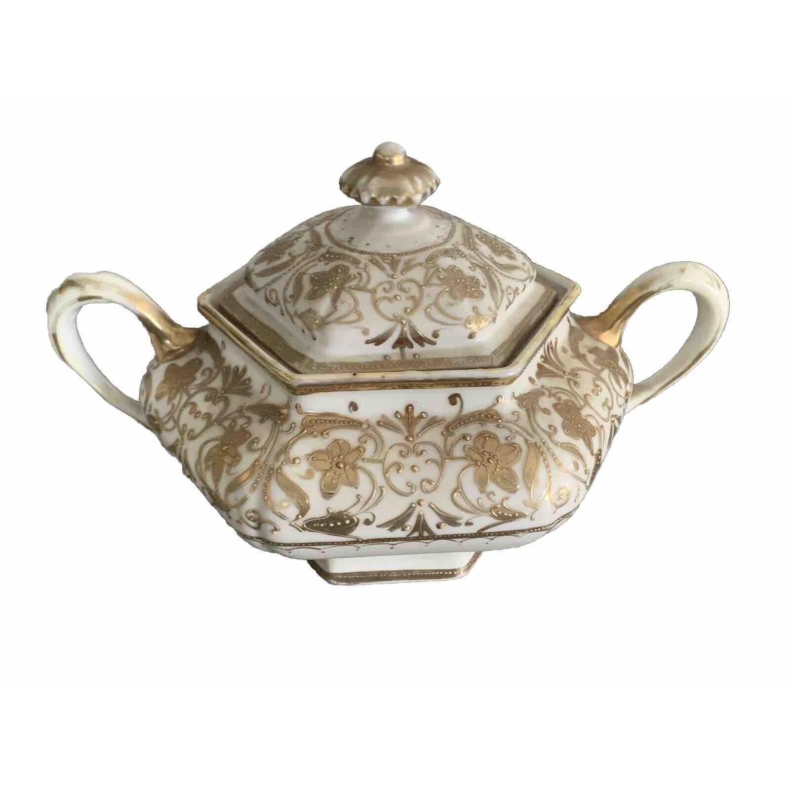Vintage Nippon Gold Gilded Moriage Porcelain Hexagon Sugar Bowl Hand Painted Lid