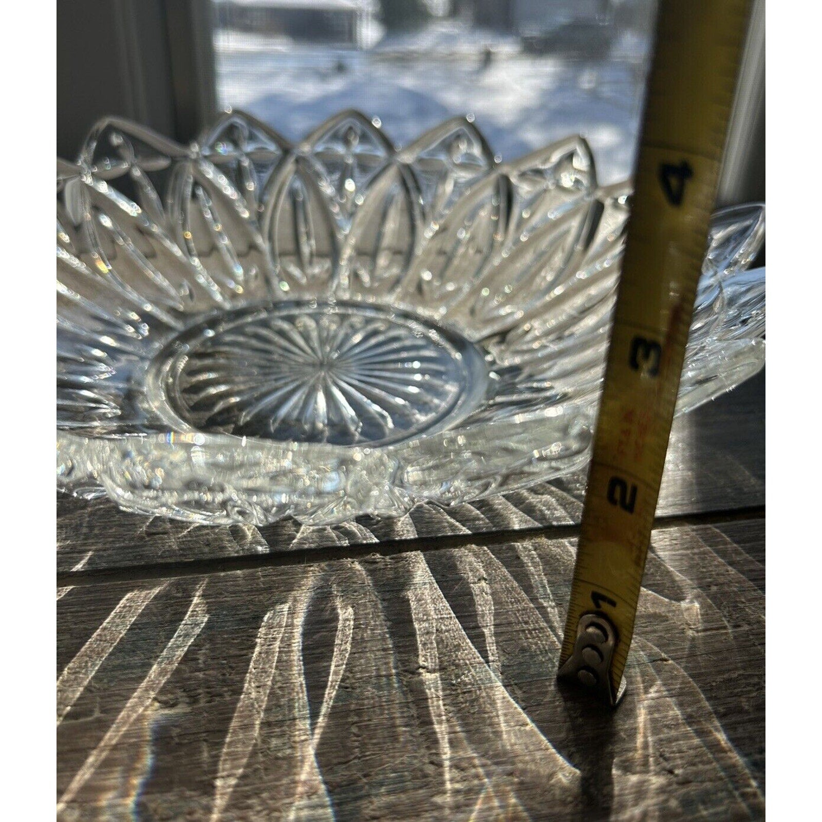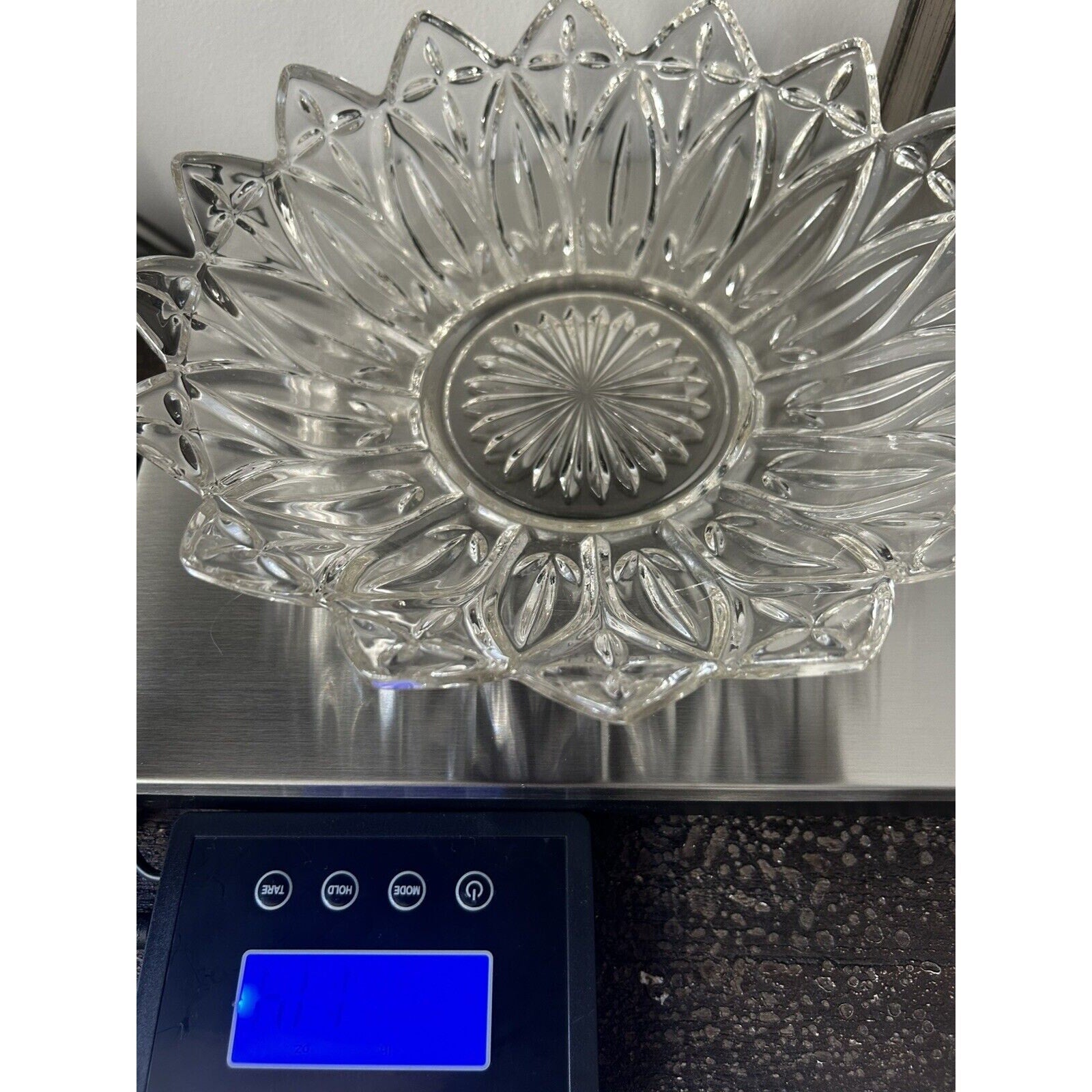 Excellent condition - no chips or cracks. Vintage Federal Glass round 10” berry bowl in clear glass. The bowl features a flower theme with a petal design. It has a glossy finish and a mirrored feature. Made of glass, it weighs 1 pound 14 ounces. The bowl is 3” in height and has a diameter of 10”.