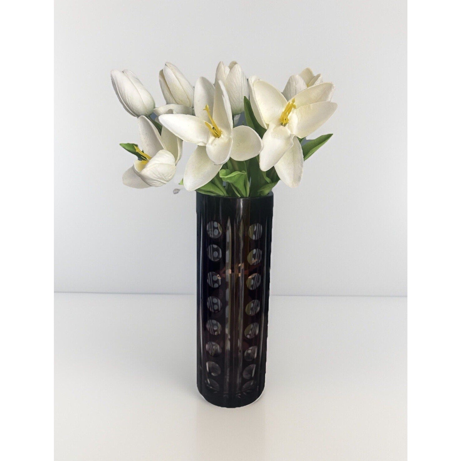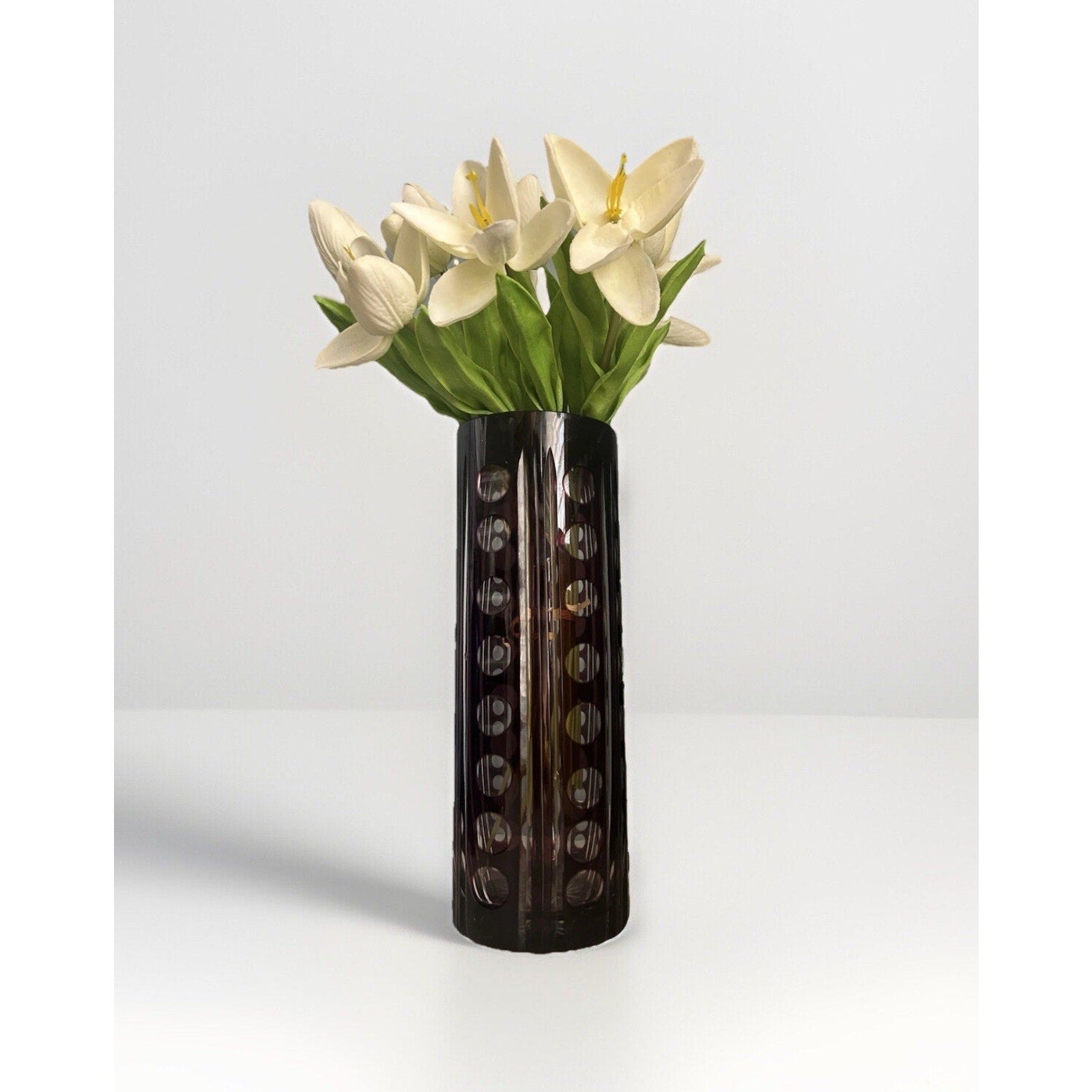 This vintage vase is a stunning addition to any collection. The beautiful purple color and art deco style make it a unique piece that is sure to catch the eye. The vase is made of amethyst and stands at 10 inches tall, with a width of 3.5 inches at the base. It weighs 2 pounds 5 ounces and is in excellent condition, ready to be displayed in your home or office. This vase is perfect for those who appreciate the beauty and craftsmanship of vintage glassware. Excellent condition. It is a vibrant purple in the sunlight. Appears darker with less light. Flowers can be included for an additional 14.95.