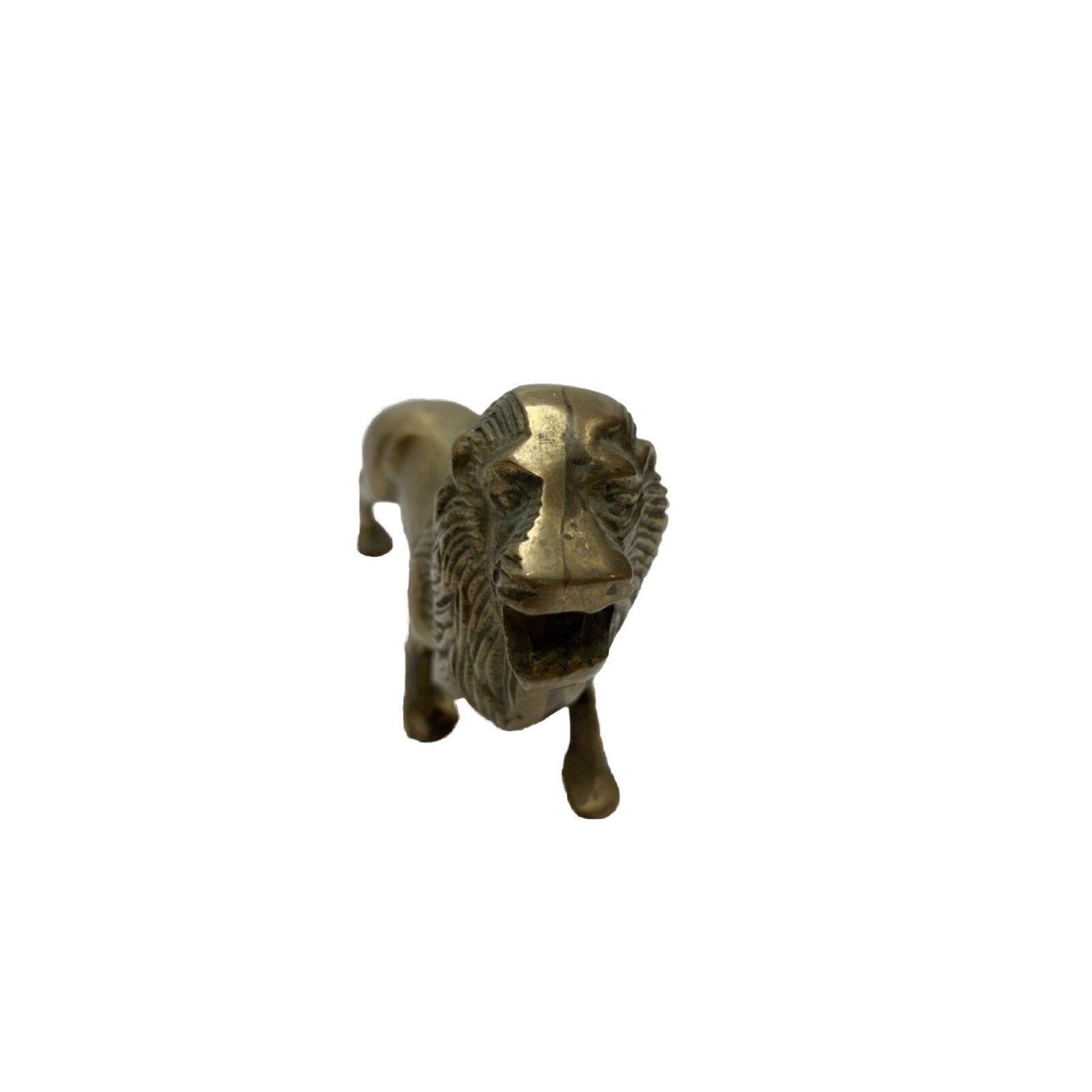 This stunning solid brass statue features a majestic lion, the king of the jungle. Its vintage charm and intricate details make it a perfect addition to any collection or a unique decorative piece for any occasion. The golden hue of the brass enhances the beauty of this lion sculpture, which is sure to impress any animal lover or art enthusiast. The lion's intense gaze and powerful stance capture the essence of this magnificent creature, making it an ideal gift or a statement piece for your home or office.