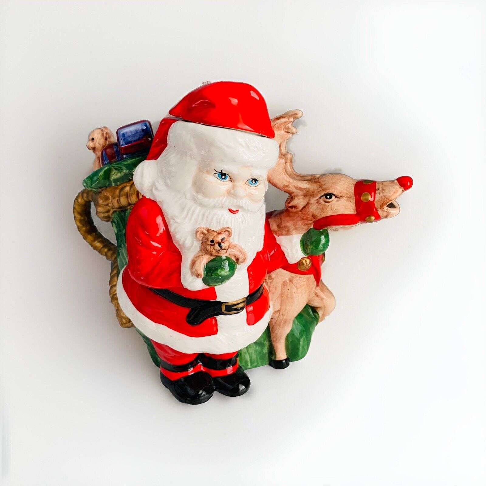 This vintage ceramic teapot features a festive design with Santa Clause and his reindeer, perfect for the Christmas holiday season. Measuring 9 inches in length, 7.5 inches in height, and 6 inches in width, this medium-sized teapot is ideal for serving tea beverages.