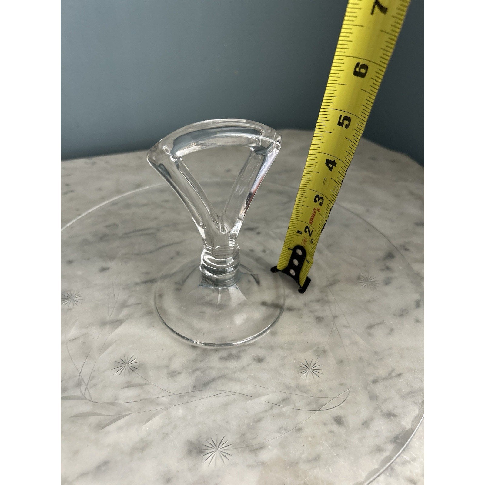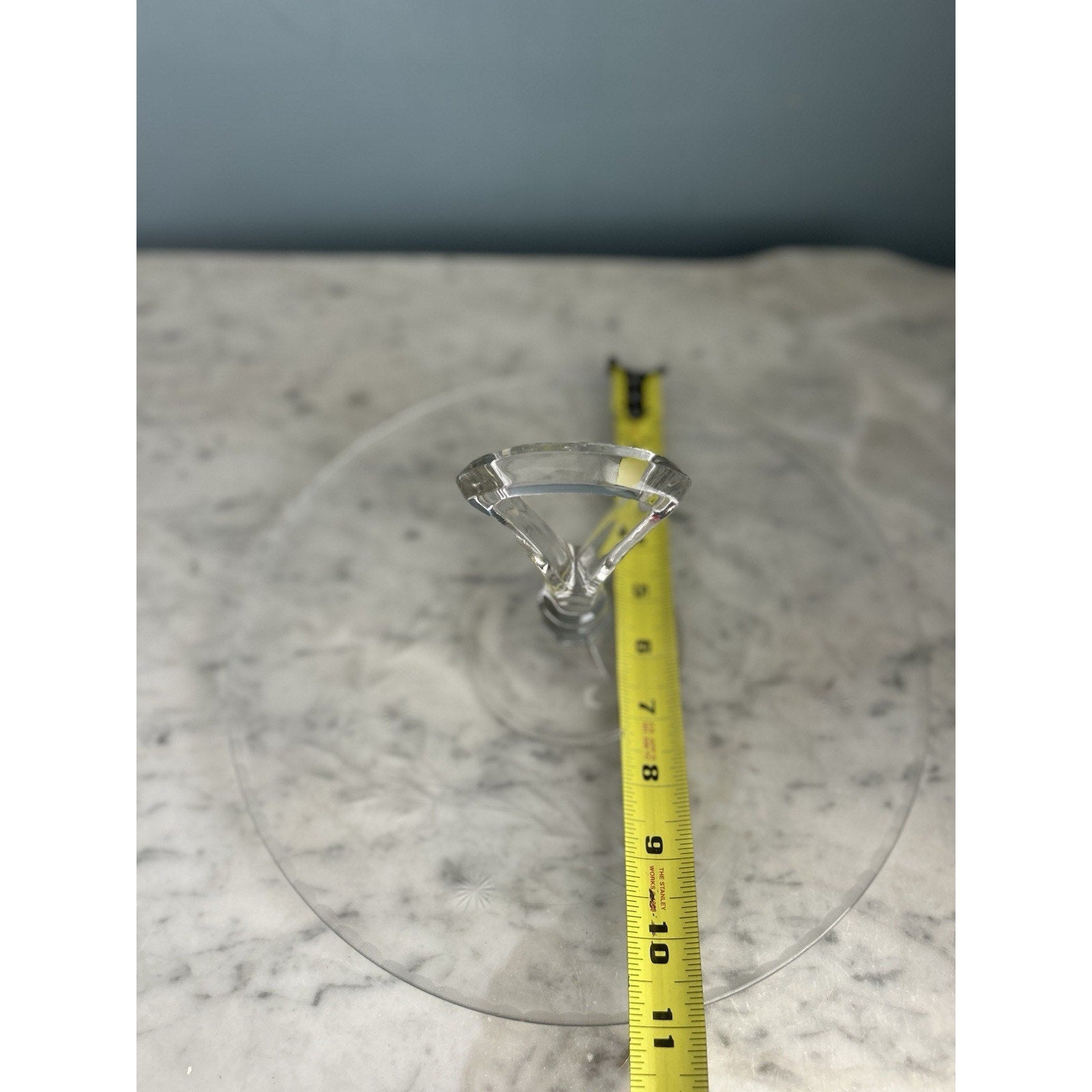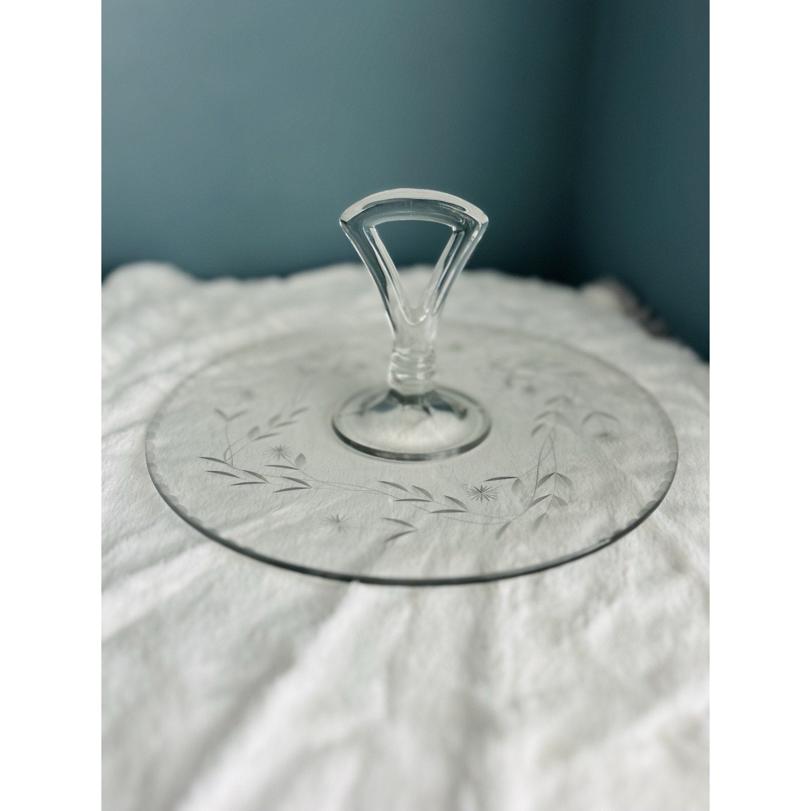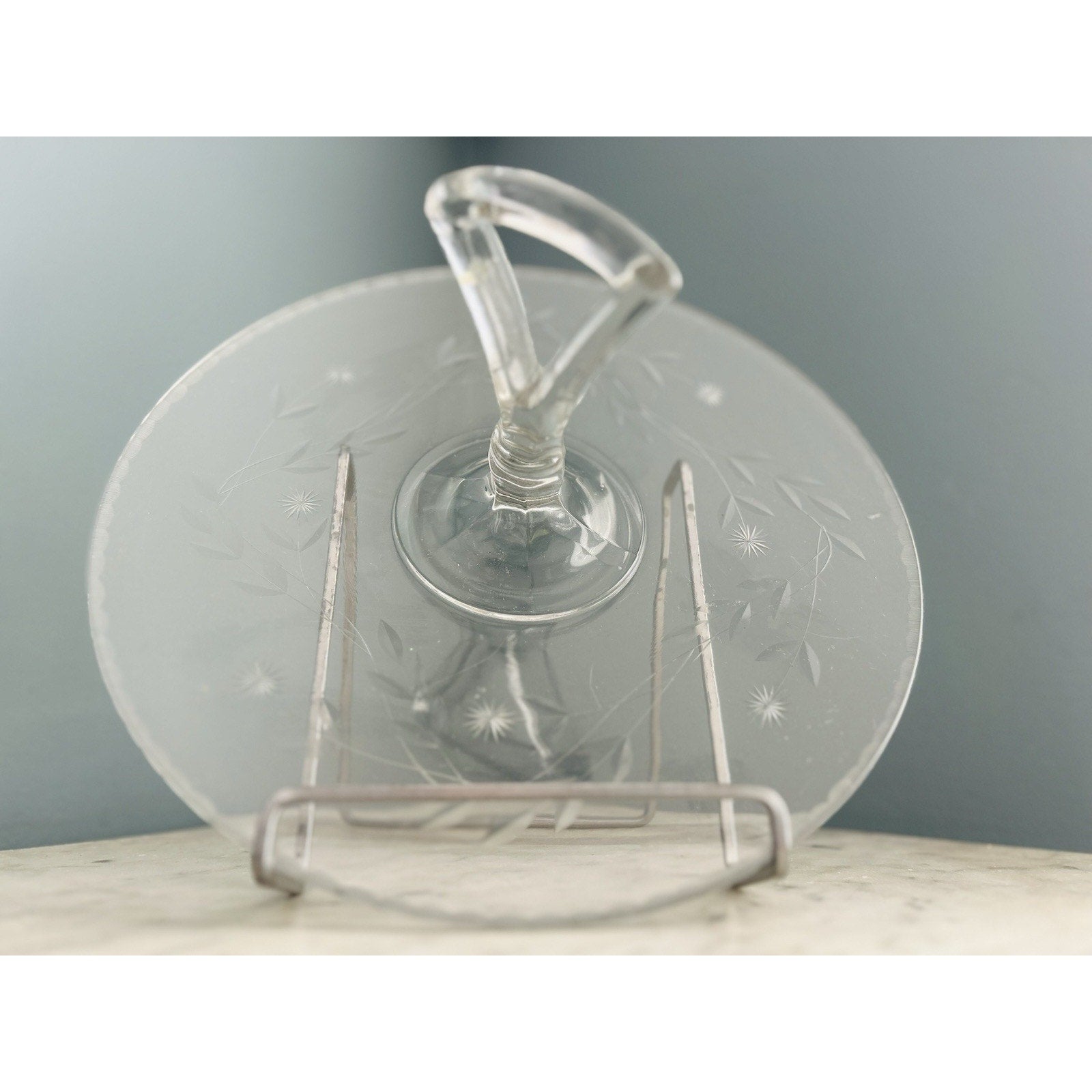 Vintage Tidbit 11” Serving Tray Dish Etched Glass Handle Floral Scallop Trim