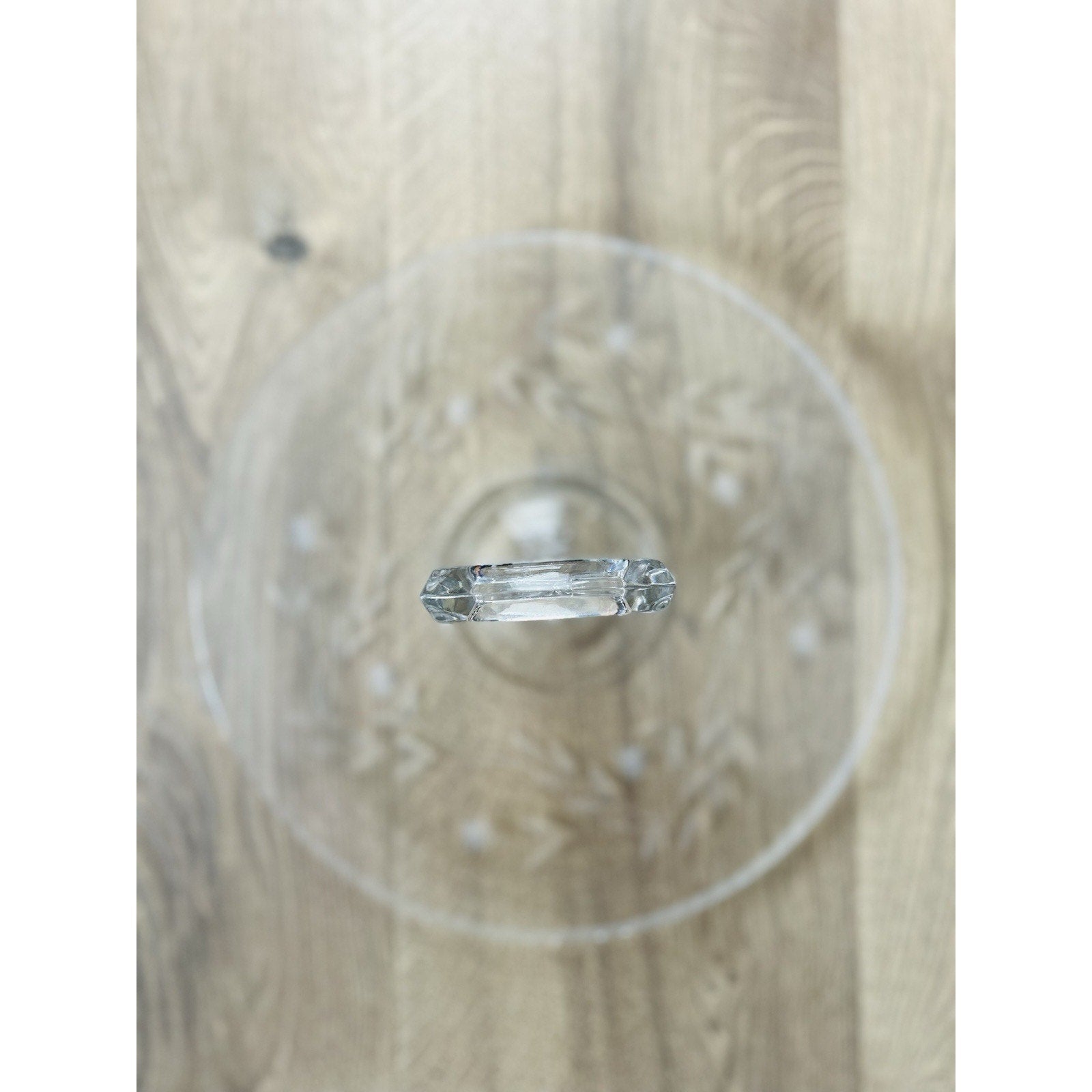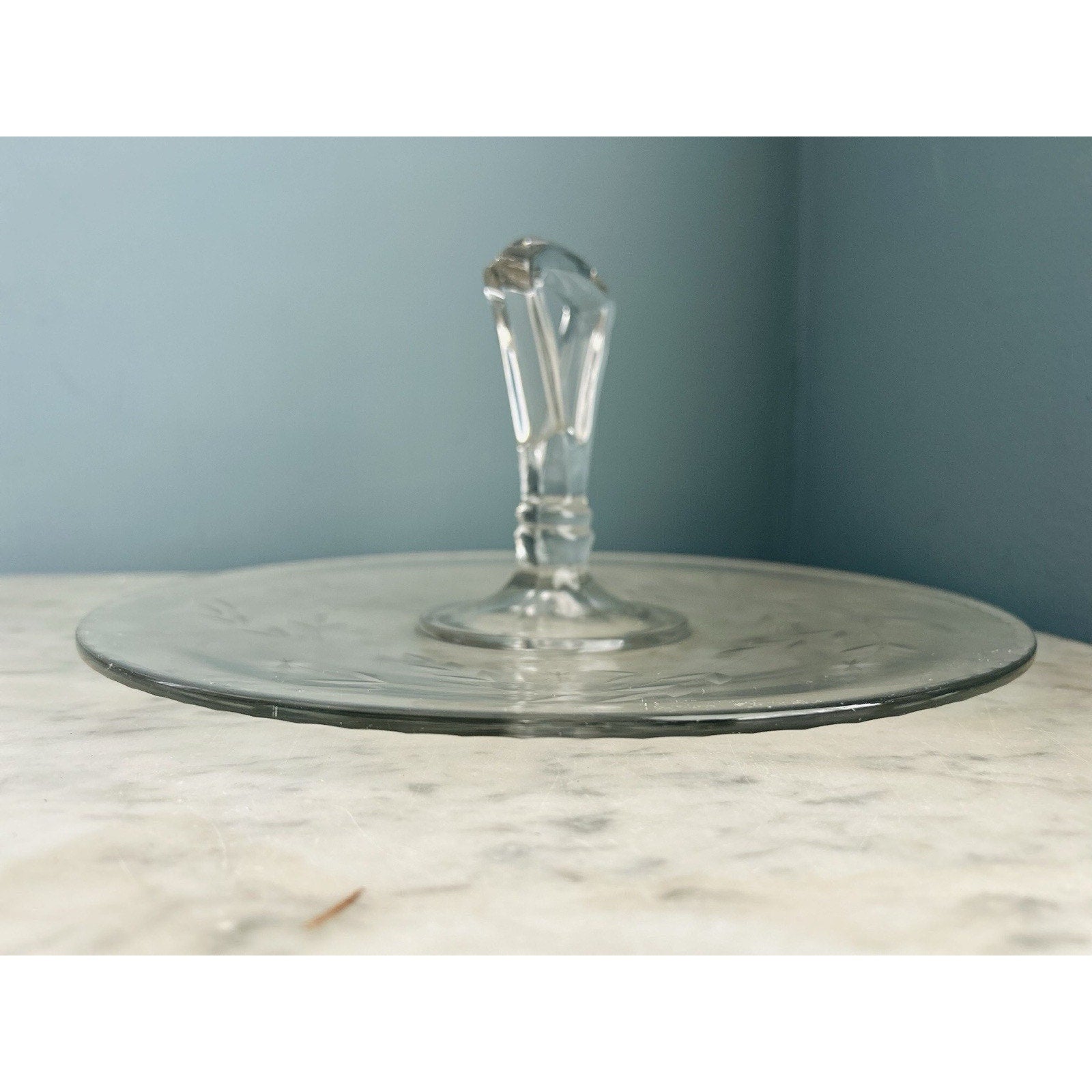 This vintage 11" serving tray features an etched glass design with floral and scallop trim details. It has handles for easy serving and is made of clear glass. Measuring 4.5" in height and 11" in diameter, this round handled server is an original piece with a retro charm.