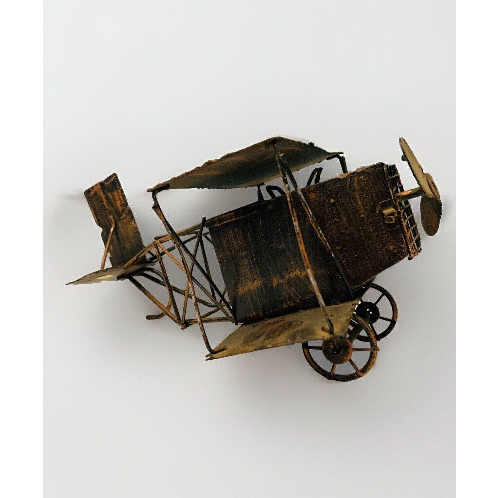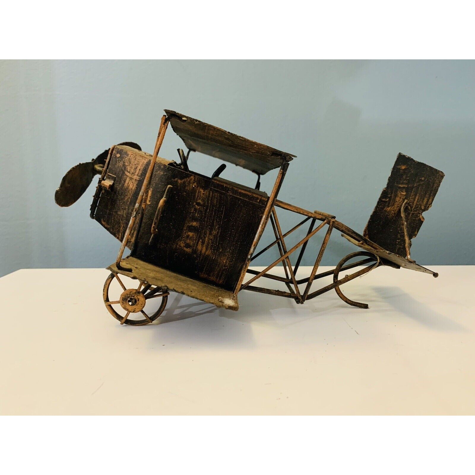 Works and winds up to play the music box. There is patina and age to the plane but such a gorgeous vintage piece to stage a bedroom, office or for any aeronautics enthusiasts. This vintage tin music box features a wind-up propeller bi-plane design, perfect for any aviation enthusiast. The handmade piece has a unique charm and character, with a metal patina that adds to its vintage appeal. The music box is a great addition to any collection and is sure to delight anyone who sees it. It is also a wonderful gift for anyone who loves music or aviation.